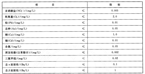 4 食品添加剂 4.1 食品添加剂质量应符合相应的标准和有关规定。 4.2 食品添加剂的品种和使用量应符合GB 2760的规定。 5 食品生产加工过程的卫生要求 应符合GB 19304的要求。 6 包装 包装容器和材料应符合相应的卫生标准和有关规定。 7 标识 定型包装的标识要求应符合有关规定。 8 贮存及运输 8.1 贮存 成品应贮存在干燥、通风良好的场所。不得与有毒、有害、有异味、易挥发、易腐蚀的物品同处贮存。 8.2 运输 运输产品时应避免日晒、雨淋。不得与有毒、有害、有异味或影响产品质量的物品混装运输。 9 检验方法 9.1 感官指标 色度、浑浊度、臭和味、肉眼可见物:按GB/T 8538规定的方法测定。 9.2 理化指标 9.2.1 亚硝酸盐、耗氧量、铅、总砷、铜、挥发性酚和镉 按GB/T 8538规定的方法测定。 9.2.2 三氯甲烷、总α放射性和总β放射性 按GB/T 5750中规定的方法测定。 9.3 微生物指标 按GB/T 4789.21规定的方法检验。