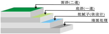 | 施工工序:◇ 墙面处理:打磨、除尘,清除突出物; ◇ 批 腻 子:依设计施工; ◇ 底 漆:滚涂或刷涂一道; ◇ 面 漆:滚涂两道。 |